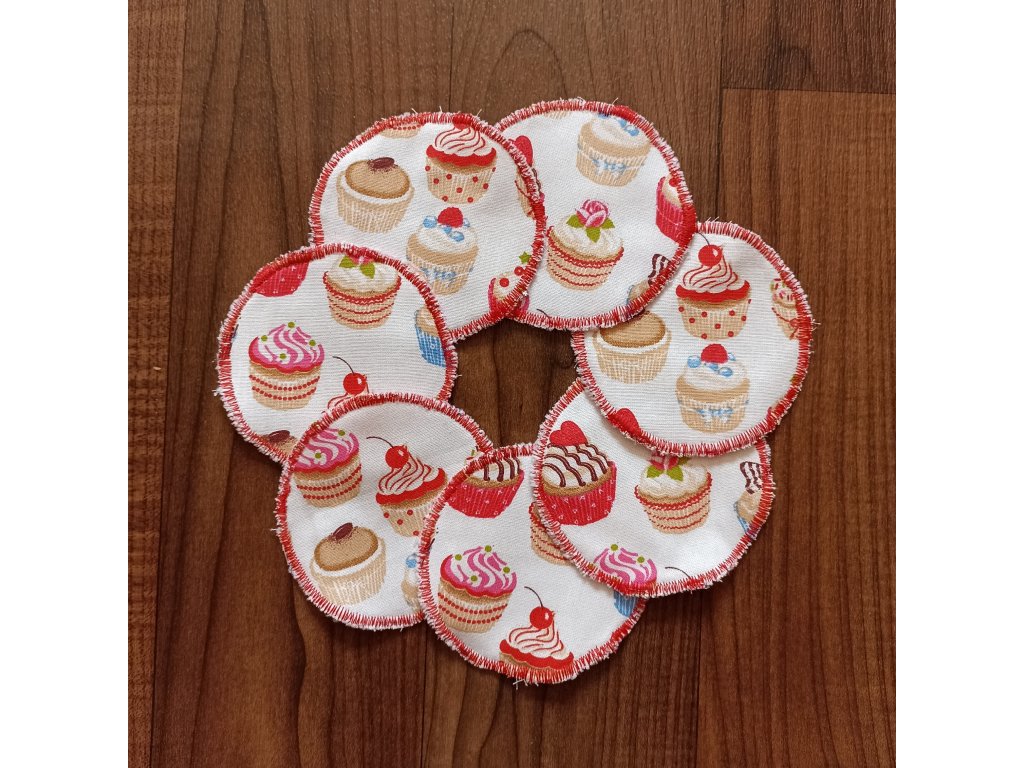 Barva: bílé pozadí s potiskem barevných cupcakes.
