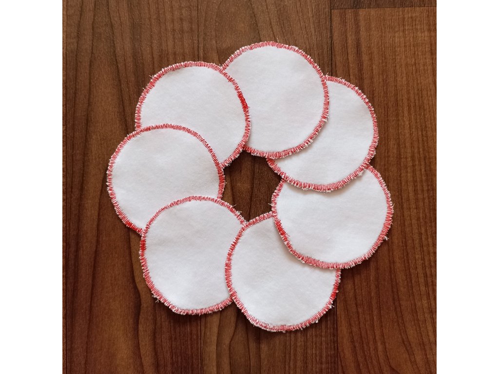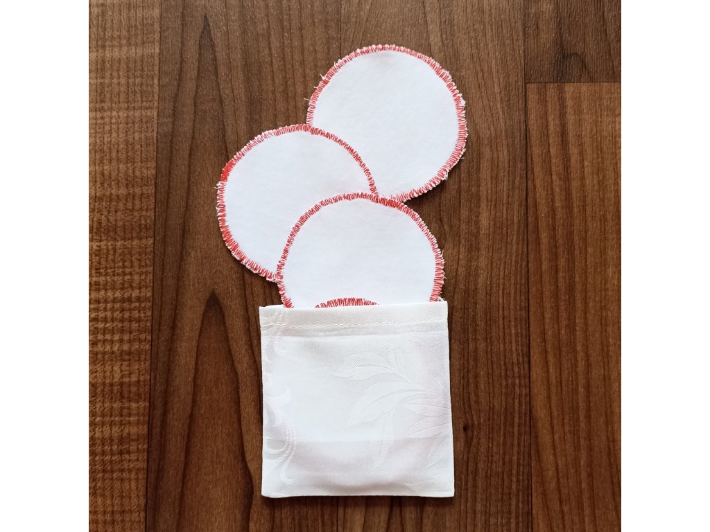 Kosmetické tampony ze 100% bavlny (barevná strana) a froté 80% bavlny a 20% PES (jemná strana). Sada 7 tamponků a praktického pytlíku na ně.