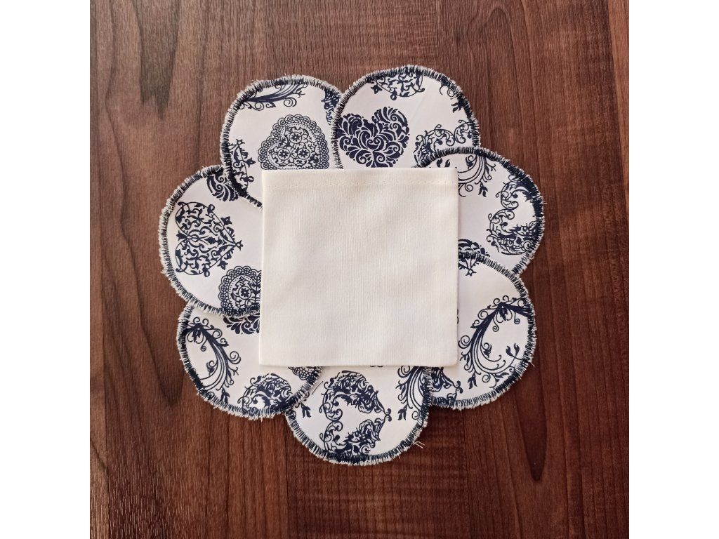 Kosmetické tampony ze 100% bavlny (barevná strana) a froté 80% bavlny a 20% PES (jemná strana). Sada 7 tamponků a praktického pytlíku na ně.